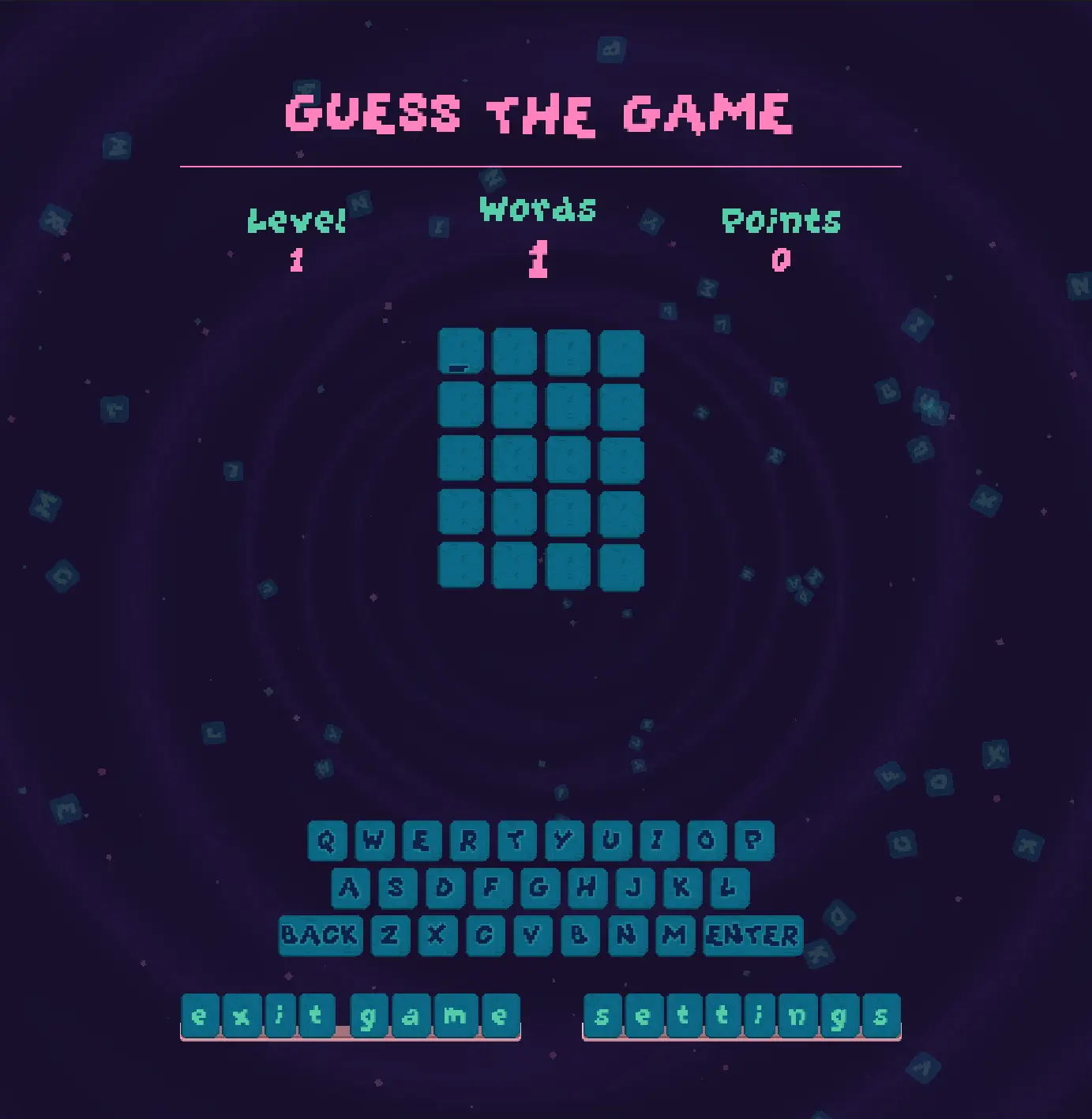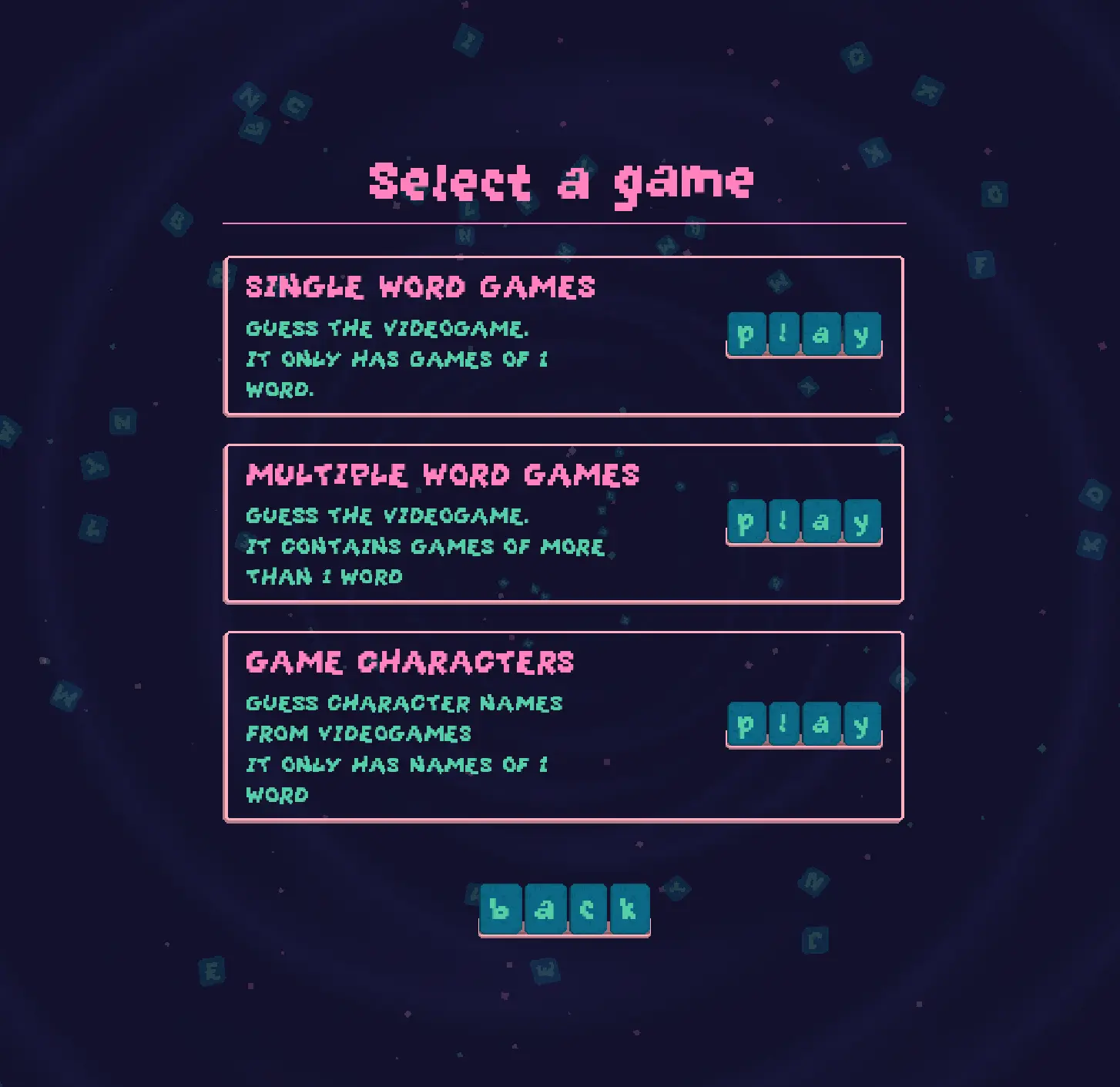 Un juego tipo Wordle de acertar nombres de videojuegos y personajes. Arte, música y programación original.